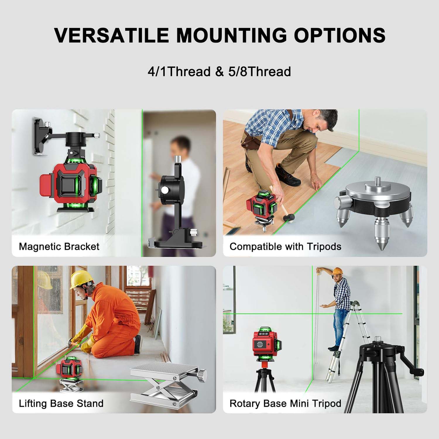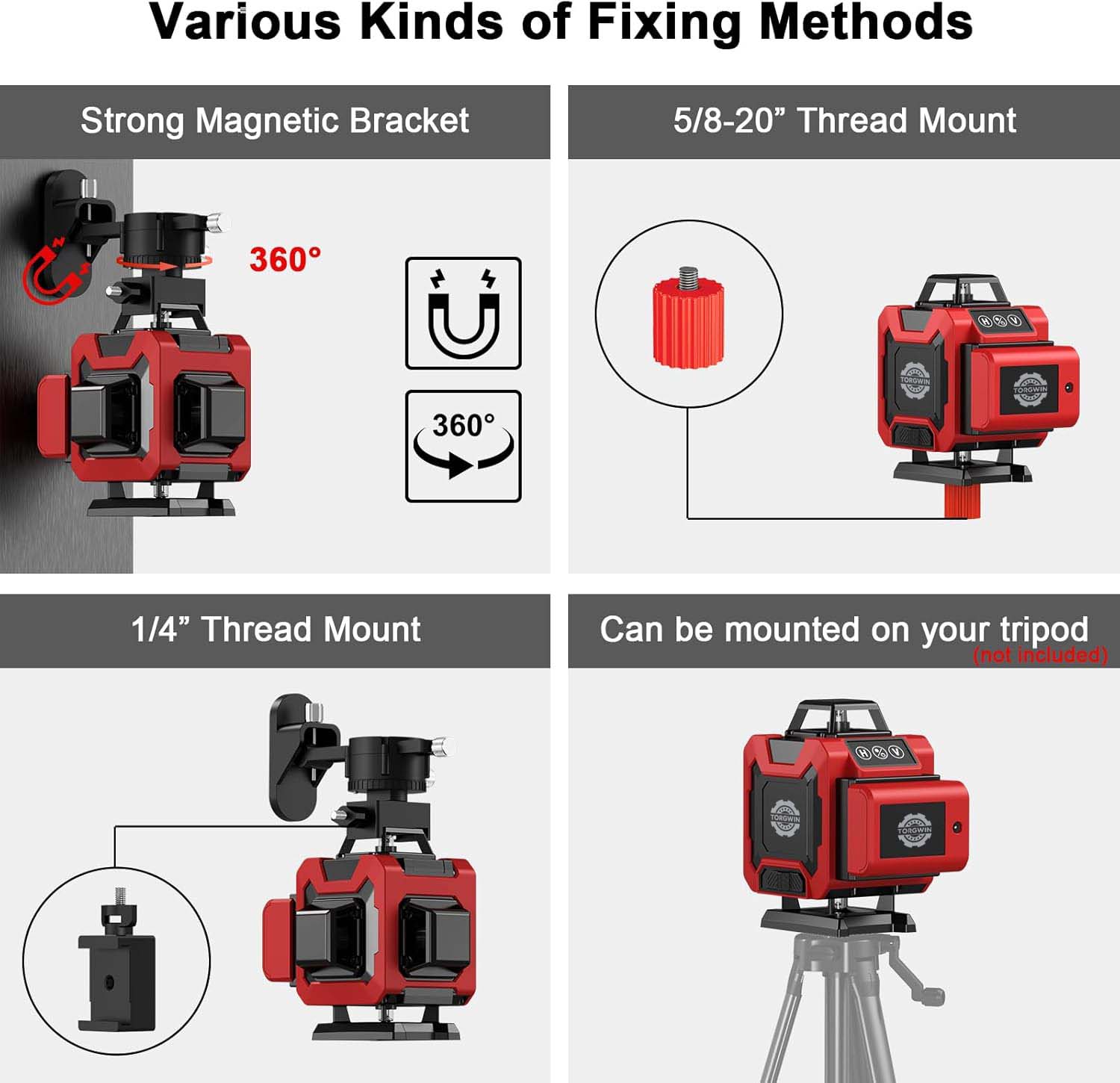 1. Różnorodne metody mocowania:Wyposażony jest w mocny uchwyt magnetyczny, który zapewnia stabilny i wygodny sposób mocowania poziomu lasera w wielu sytuacjach. Mocowanie z gwintem 5/8 - 20" pozwala na podłączenie do konkretnych urządzeń lub konstrukcji z tego typu gwintem. Mocowanie z gwintem 1/4" oferuje również inną opcję montażu, zwiększając jego kompatybilność z różnymi akcesoriami.